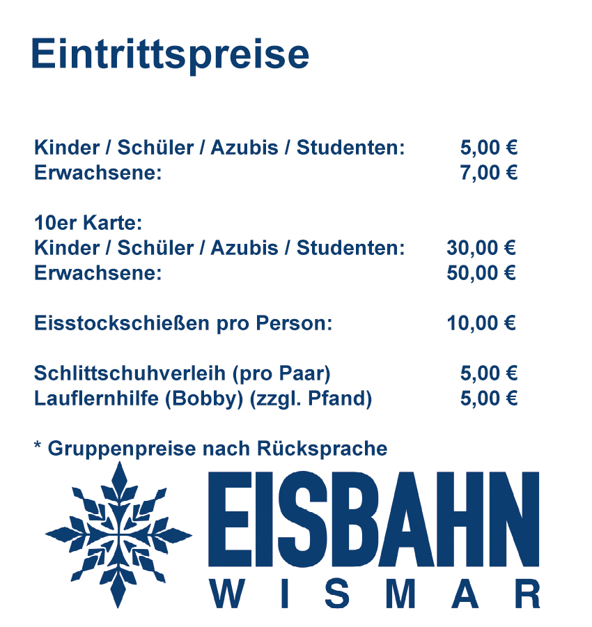Aktuelle Hinweise zu veränderten Öffnungszeiten veröffentlichen wir auf unserer Facebookseite unter: https://www.facebook.com/EisbahnWismar/